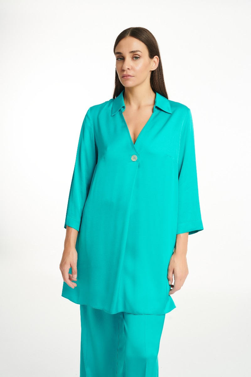 Πουκαμίσα σατέν με V ντεκολτέ, γιακά και διακοσμητικό κουμπί. Σύνθεση: 52% VIS ECOVERO 48% RAY ΕΥΡΩΠΗΣ